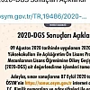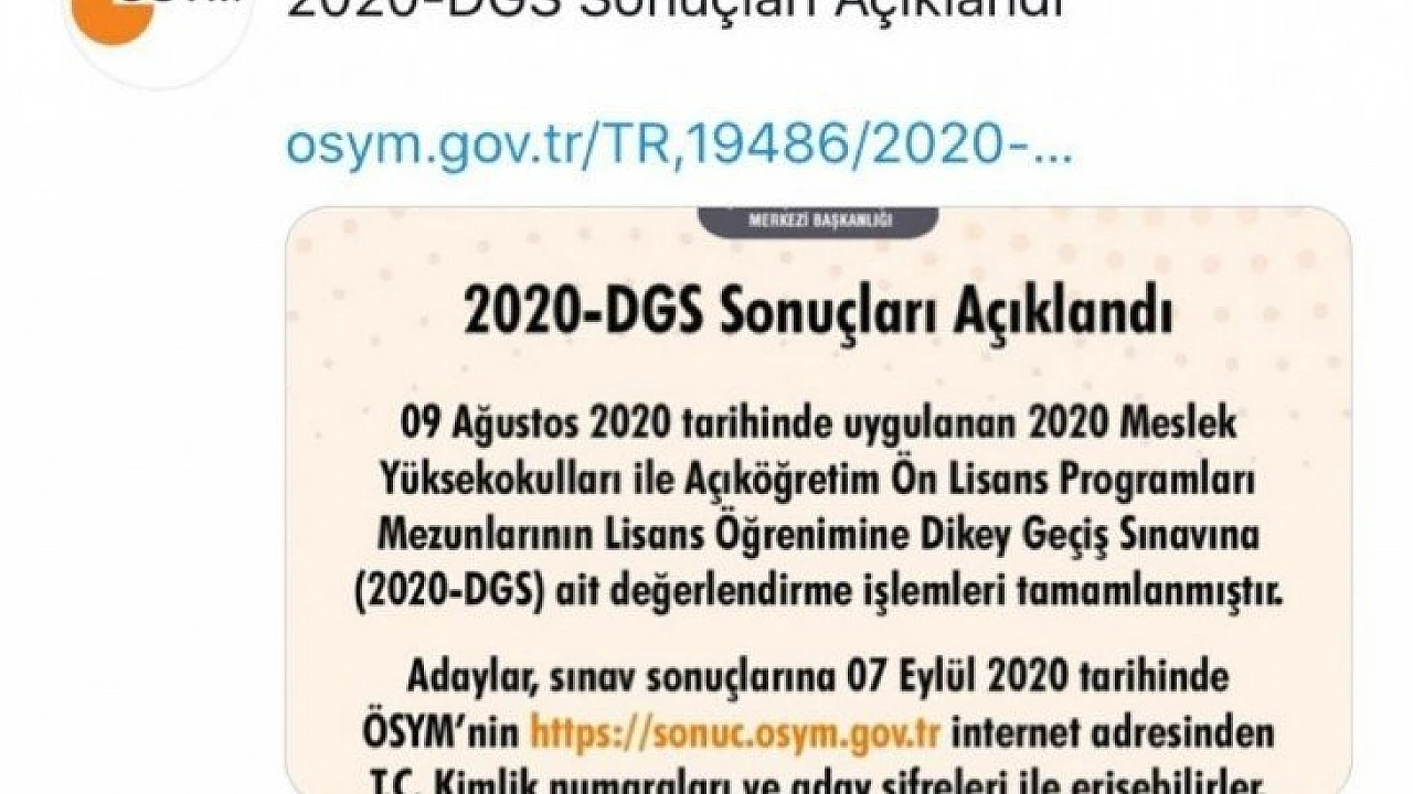 Ölçme, Seçme ve Yerleştirme Başkanlığı (ÖSYM) tarafından 9 Ağustos 2020 tarihinde gerçekleştirilen 2020 - Dikey Geçiş Sınavı’nın (DGS) sonuçları açıklandı. Sınav sonuçlarına dair haber ÖSYM’nin sosyal medya hesabı ve ÖSYM Başkanı Prof. Dr. Halis Aygün’ün sosyal medya hesabı üzerinden duyuruldu.