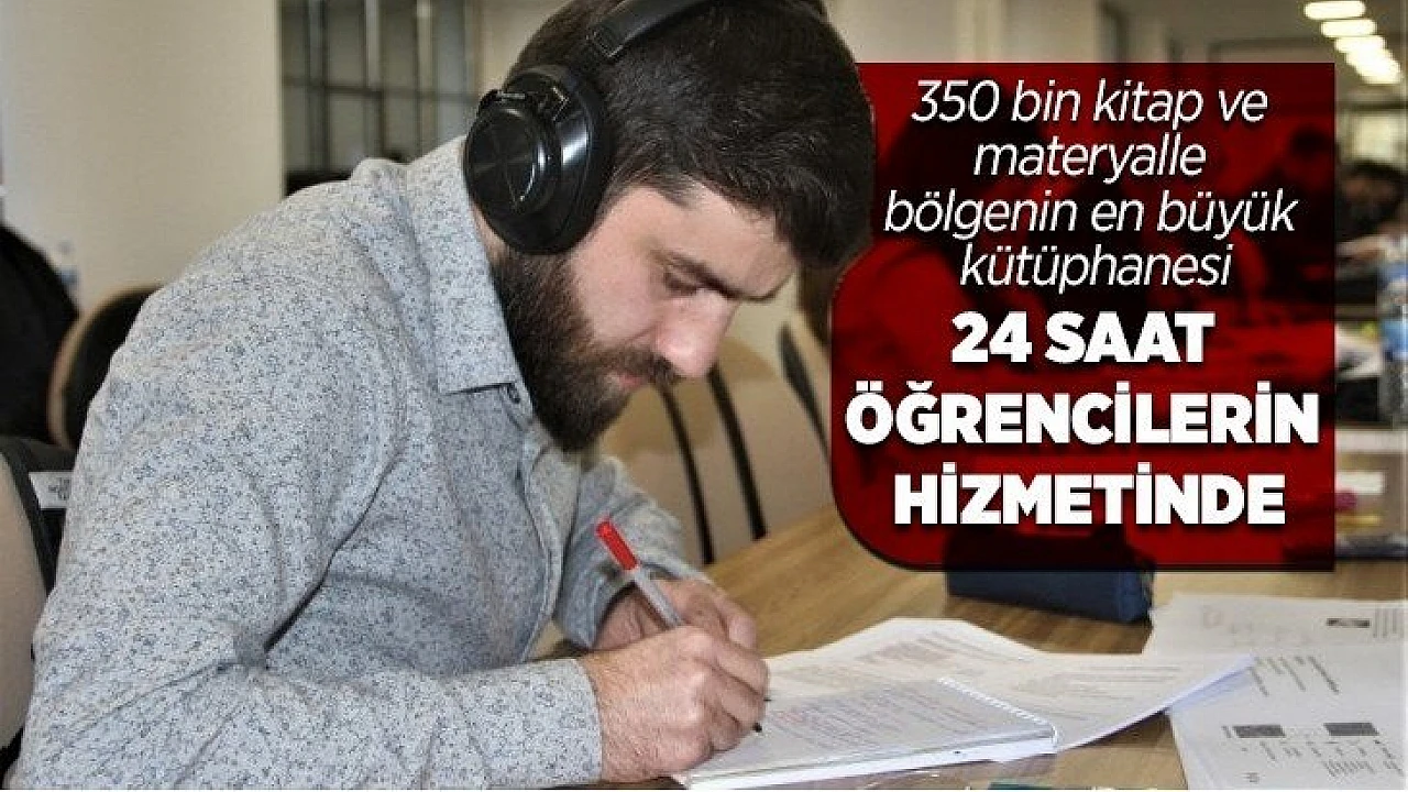 350 bin kitap ve materyalle bölgenin en büyük kütüphanesi 24 saat öğrencilerin hizmetinde