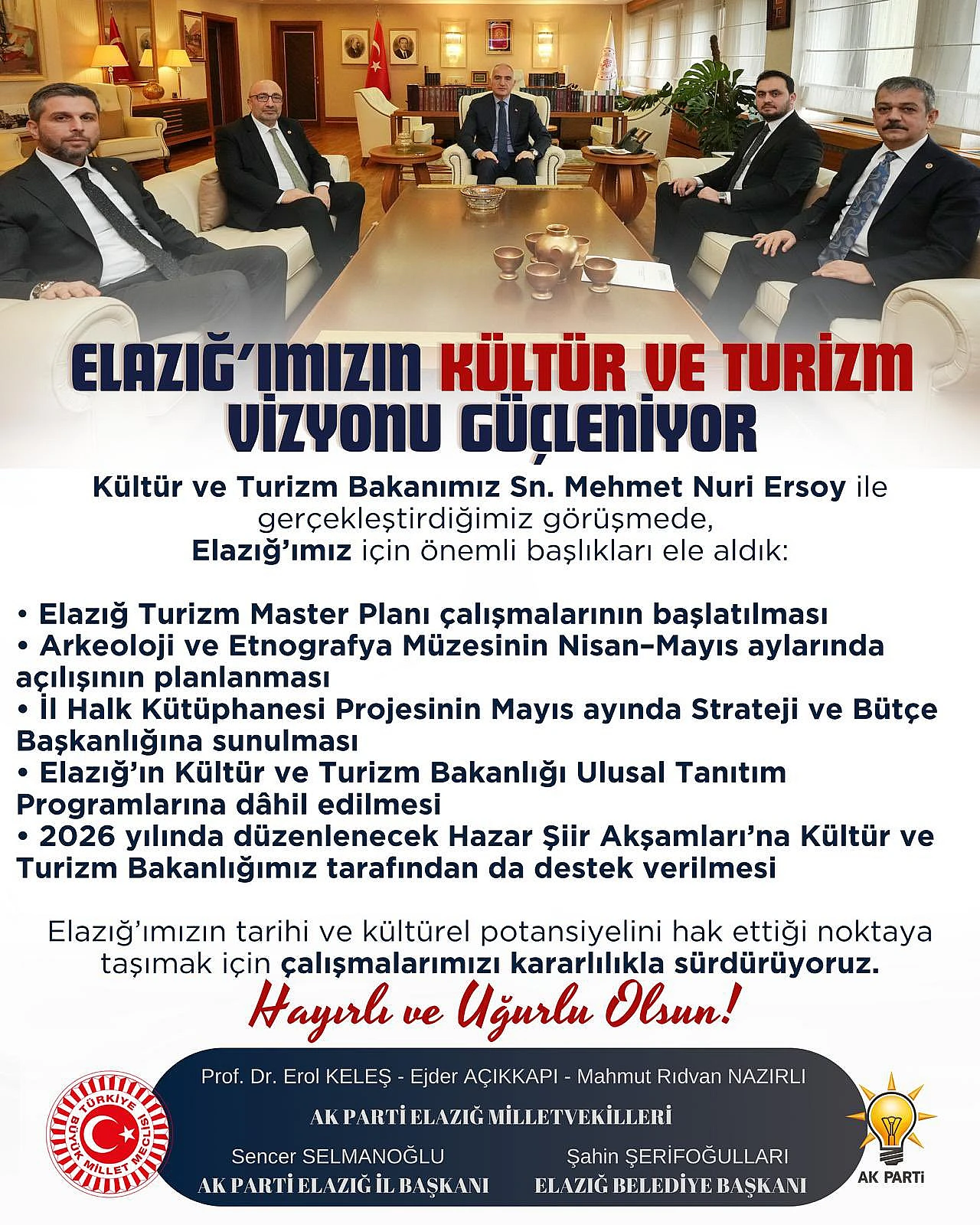 AK Parti Elazığ Milletvekilleri Prof. Dr. Erol Keleş, Ejder Açıkkapı, Mahmut Rıdvan Nazırlı ile AK Parti Elazığ İl Başkanı İbrahim Sencer Selmanoğlu, Kültür ve Turizm Bakanı Mehmet Nuri Ersoy ile gerçekleştirdikleri görüşmede Elazığ'ın Kültür ve Turizm alanındaki öncelikli projelerini ele aldı.