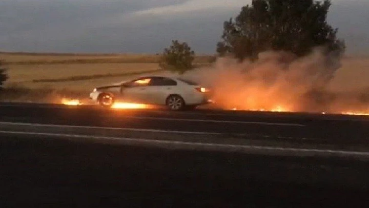 Alev alan otomobilden canını zor kurtardı