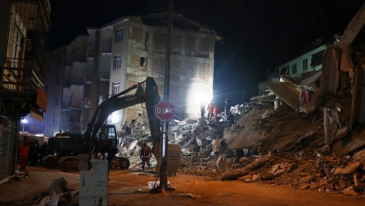 Elazığ'daki 6,8'lik depremde yıkılan binanın enkazından arama kurtarma çalışmaları UMKE,AFAD, ITFAIYE ekipleri ve hassas burunlu eğitimli köpek eşliğinde devam ediyor.