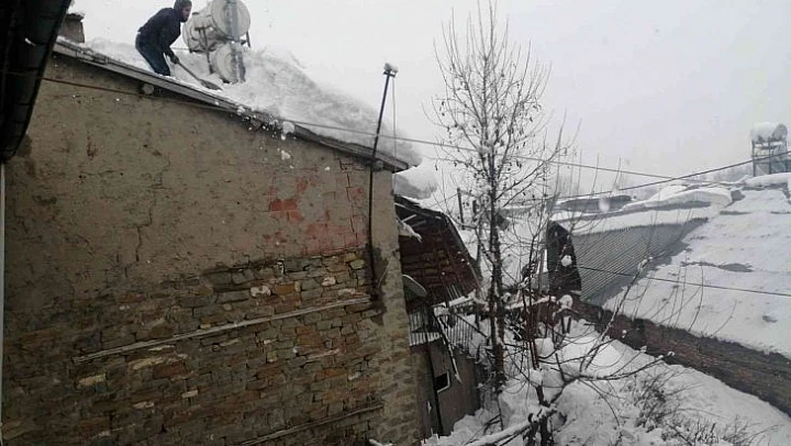 Arıcak'ta vatandaşlar, çatılarda biriken kar birikintilerini temizledi