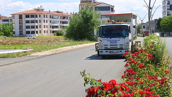 Yol yenileme çalışmalarının tamamlandığı bölgelerde trafik güvenliğini artırmak için yol çizgi, yaya çizgisi ve işaret çalışmaları yürütülüyor.