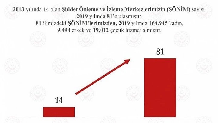 Aile, Çalışma ve Sosyal Hizmetler Bakanı Zehra Zümrüt Selçuk, 2013 yılında 14 olan Şiddet Önleme ve İzleme Merkezi (ŞÖNİM) sayısının, 2019 yılında 81'e ulaştığını açıkladı.