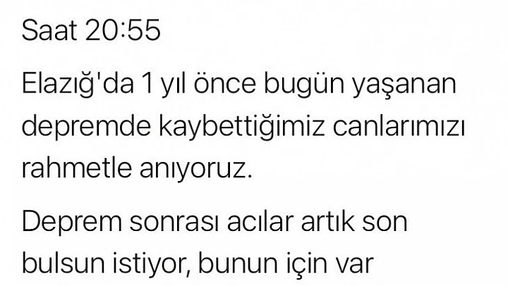 Yapılan deprem konutlarını incelemek üzere Elazığ'da bulunan Çevre ve Şehircilik Bakanı Murat Kurum, Twitter hesabından paylaşım yaptı. Bakan Kurum geçtiğimiz yıl bugün Elazığ'da yaşanan depremi anımsattığı paylaşımında, ”Elazığ'da 1 yıl önce bugün yaşanan depremde kaybettiğimiz canlarımızı rahmetle anıyoruz. Deprem sonrası acılar artık son bulsun istiyor, bunun için var gücümüzle çalışarak ülkemizi depremlere hazır hale getiriyoruz. Güvenli yarınlar için bu son olsun” ifadelerini kullandı.