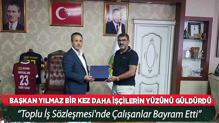 'Toplu İş Sözleşmesi'nde Çalışanlar Bayram Etti' Yurtbaşı Belediyesi ile Hizmet İş Sendikası arasında gerçekleşen Toplu İş Sözleşmesi tamamlandı. Gerçekleşen sözleşme ile Yurtbaşı Belediyesi çalışanları adeta bayram etti. Yurtbaşı Belediye Başkanı Yasin Yılmaz, çalışanları sevindirecek bir sözleşmeye imza atarak bir kez daha en yüksek rakamı mesai arkadaşlarına tevdi etti.