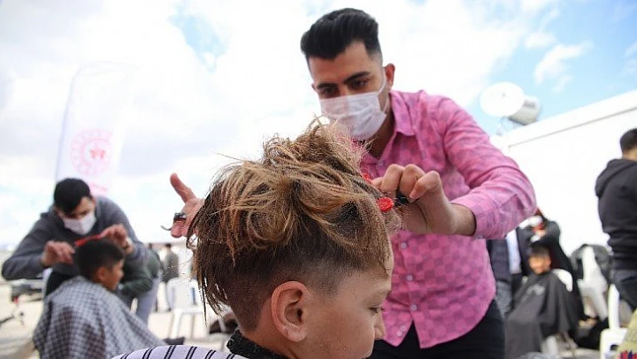 Elazığ depreminden sonra geçici barınma merkezi olarak hazırlanan konteyner kentlerde aileleri ile yaşayan çocuklar için aynı anda 13 berber ücretsiz olarak hizmet verdi. Çocukların saçlarını kesen berberler, isteklerine göre de şekillendirmeyi ihmal etmedi.