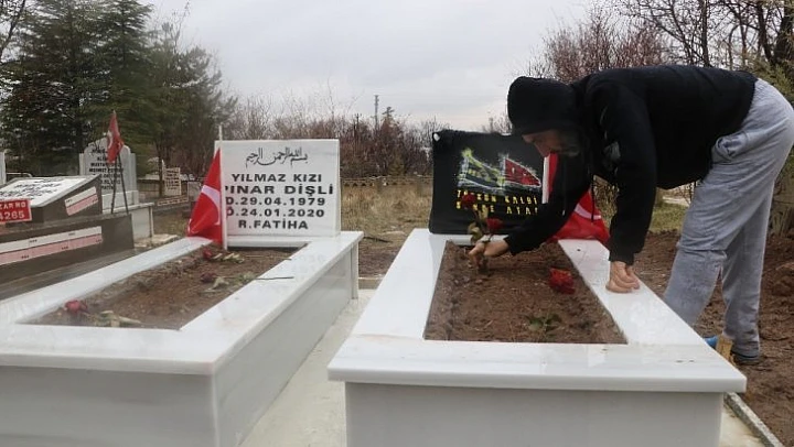 Elazığ'da depremde hayatını kaybeden 13 yaşındaki Miraç'in bugün doğum günü olması nedeniyle hastaneden çıkan baba Meriç Dişli, yan yana yatan oğlu ve eşinin mezarına gitti, duygusal anlar yaşadı.