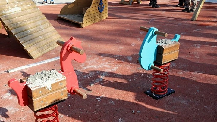 Bursa'nın Mudanya ilçesinde çocuk parkında bulunan eğlence aletlerine beton dökülerek zarar verildi.