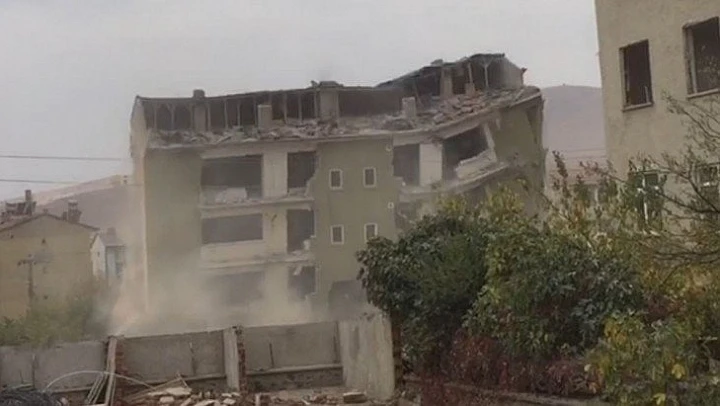 Elazığ'da depremde hasar gören yapıların yıkımı kent genelinde sürerken, 5 katlı iki binanın ekiplerin kontrollü yıkım çalışmasında çökme anı kameraya yansıdı.