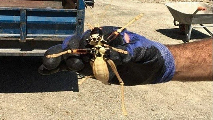 Deliktaş köyünde bir vatandaşın bahçesinde görülen dev çekirge, görüntüsüyle ürkütürken, meraklıların da ilgi odağı oldu.