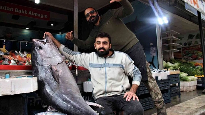 Samsun'da balıkçılar tarafından yakalanan dev orkinos balığı, Elazığ'da bir balıkçıda sergilendi. 180 santimetre uzunluğunda ve 144 kilo ağırlığındaki dev orkinos yoldan geçen vatandaşların ilgi odağı oldu. Orkinosun kilosunun 70 liradan satışa çıkarılacağı belirtilirken vatandaşlar da balıkla sırayla fotoğraf çekti.