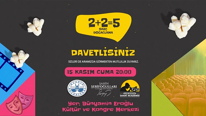 Geçtiğimiz dönemlerde sahne alan ve büyük beğeni toplayan “2+2=5” isimli skeç, kısa film ve doğaçlama, 15 Kasım Cuma akşamı saat 20.00'de Elazığ Belediyesi Bünyamin Eroğlu Kültür ve Kongre Merkezi'nde bir kez daha sahne alacak. Elazığ Belediyesi Kültür ve Sosyal İşler Müdürlüğü bünyesindeki çalışmalar doğrultusunda Sanat Akademisi'nin düzenleyeceği gösteri, ücretsiz olacak. Ayrıca, gösteri her ay periyodik olarak ücretsiz olarak sanatseverlerle buluşmaya devam edecek.