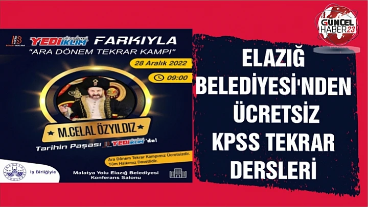Bu kapsamda Elazığ Belediyesi, Kamu Personeli Seçme Sınavı'na hazırlanan memur adayları için 27 Aralık Salı günü ve 28 Aralık Çarşamba günü saat 09.00'da Elazığ Belediyesi Bünyamin Eroğlu Kültür ve Kongre Merkezi'nde ücretsiz KPSS Tekrar Programı düzenleyecek.