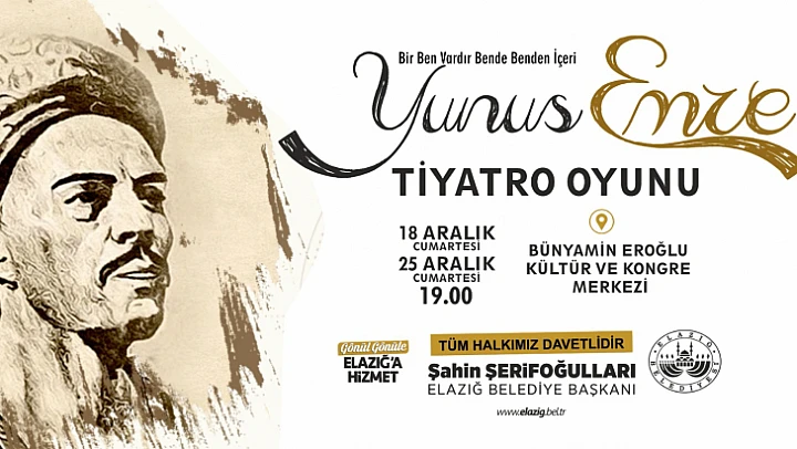 Elazığ Belediyesi Basın-Yayın ve Halkla İlişkiler Müdürlüğü'nden yapılan açıklamada, “Türk dilinin ve kültürünün en önemli şahsiyetlerinden olan Yunus Emre'nin vefatının 700. yıl dönümü olması münasebetiyle “Yunus Emre” adlı oyun 18 Aralık Cumartesi ve 25 Aralık Cumartesi günlerinde saat 19.00'da Bünyamin Eroğlu Kültür ve Kongre Merkezi'nde sahnelenecek. Ücretsiz olarak izleyici ile buluşacak tiyatro gösterimine tüm hemşehrilerimiz davetlidir.” denildi.
