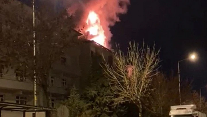 Elazığ'da depremde boşaltılan bir binanın çatısı alev alev yandı. İtfaiye ekipleri yangını diğer binalara sıçramadan söndürdü.
