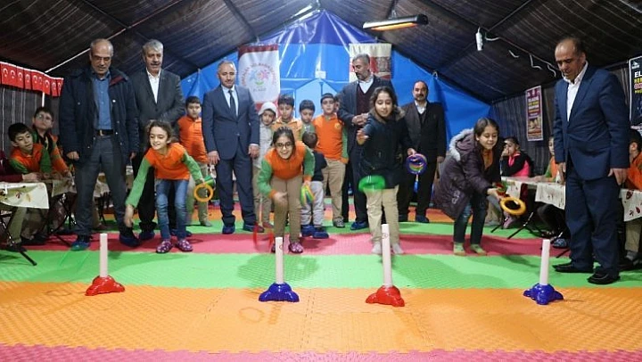 Elazığ'da meydana gelen 6.8 büyüklüğündeki deprem sonrası okullarda eğitim gören öğrencilerin sosyal anlamda desteklenmesi için bir okulda etkinlik ve çalışma çadırı kuruldu.