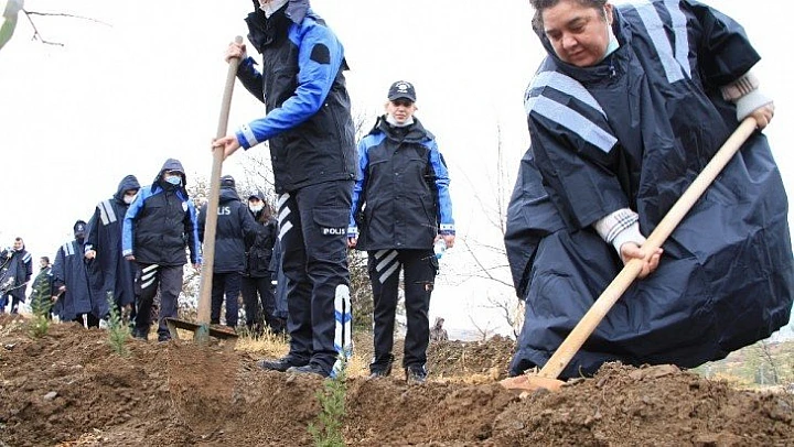 Elazığ'da "Bir Fidan Toprağa, Bin Nefes Geleceğe" seferberliği kapsamında başlatılan kampanya kapsamında İl Emniyet Müdürlüğü personeli, Elazığ ve İzmir depreminde hayatını kaybedenlerin anısına binlerce fidanı toprakla buluşturup, dua etti.