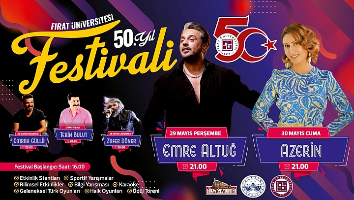 Fırat Üniversitesi, kuruluşunun 50. yılını çeşitli etkinliklerle kutlamaya devam ediyor. 26-30 Mayıs tarihleri arasında gerçekleştirilecek olan 'Fırat Üniversitesi 50. Yıl Festivali', konserlerden bilimsel etkinliklere, sportif etkinliklerden geleneksel oyunlara kadar pek çok programla üniversite öğrencilerine ve Elazığ halkına unutulmaz bir hafta yaşatacak.