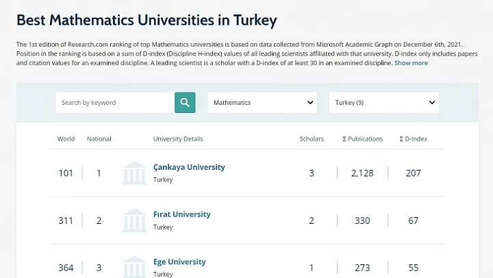 Ayrıca aynı internet sitesinde D-indeks değerleri dikkate alınarak akademisyenler arasında alan bazlı olarak yapılan değerlendirme sonucunda veterinerlik alanında Prof. Dr. Münir Aktaş Türkiye'de 1., makine mühendisliği ve havacılık alanında Prof. Dr. Hakan Fehmi Öztop Türkiye'de 1., biyoloji ve biyokimya alanında Prof. Dr. Kazım Şahin Türkiye'de 2., malzeme bilimi alanında Prof. Dr. Fahrettin Yakuphanoğlu Türkiye'de 4., bilgisayar bilimleri alanında Prof. Dr. Abdulkadir Şengür Türkiye'de 5., matematik alanında Prof. Dr. Hasan Bulut Türkiye'de 5., makine mühendisliği ve havacılık alanında Prof. Dr. Yasin Varol Türkiye'de 8. olarak listeye girmeye hak kazanan akademisyenler oldu.