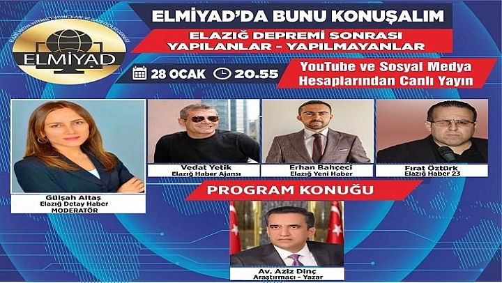 Moderatörlüğünü ELMİYAD Başkanı Gazeteci Gülşah Altaş'ın üstleneceği “ELMİYAD'da Bunu Konuşalım” adlı programa, Elazığ Yeni Haber Sitesi'nden Erhan Bahçeçi, Elazığ Haber Ajansı ve Elazığ News'ten Vedat Yetik, Elazığ Haber 23'ten Fırat Öztürk katılacak. Ayrıca programa Araştırmacı – Yazar Av. Aziz Dinç'te yorumları ile katkı sunacak.