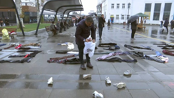 Etkinlikte yerlere serilen kıyafet ve ayakkabılar ile “Gazze'ye Engel Olma” yazılarak yaşanan soykırım dernek üyeleri tarafından temsili olarak canlandırıldı.