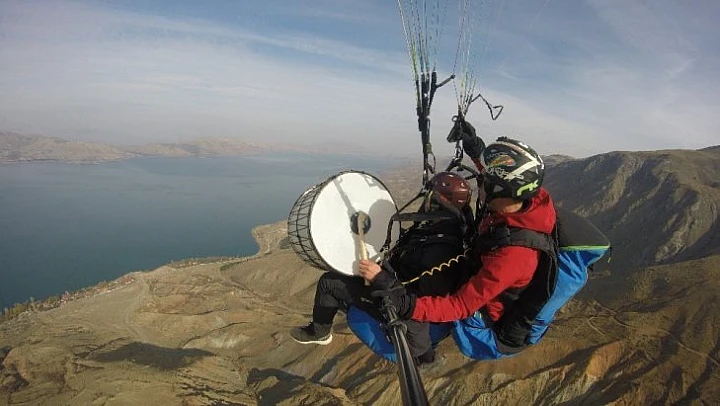 Elazığ'da bir kişi birlikte uçtuğu Yamaç Paraşütü Pilotu Kenan Şaksu ile gökyüzünde davul çalıp türkü söyledi.