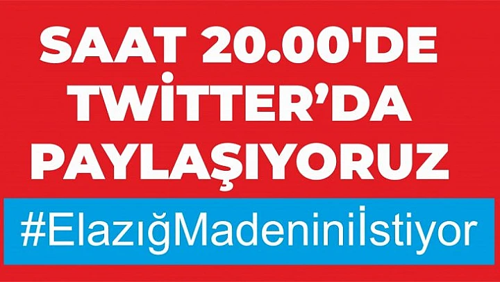 Etkin kamuoyu oluşturulması amacıyla bugün tam saat 20.00' de twitterda #ElazığMadeniniİstiyor etiketiyle paylaşım yaparak sürece destek olmanızı beklemekteyiz.