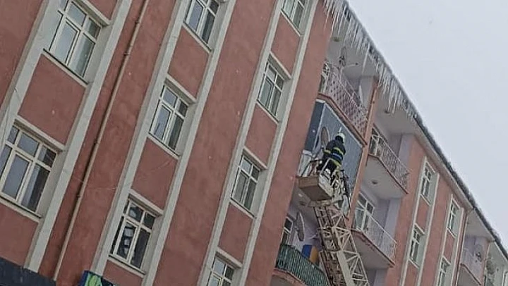 Elazığ'ın Karakoçan ilçesinde bulunan yüksek katlı binaların çatılarında oluşan buz sarkıtlarının herhangi bir olumsuzluğa neden olmaması için harekete geçen itfaiye ekipleri, itfaiye merdiveninin yardımıyla binaların çatılarında oluşan buz sarkıtlarını temizledi.