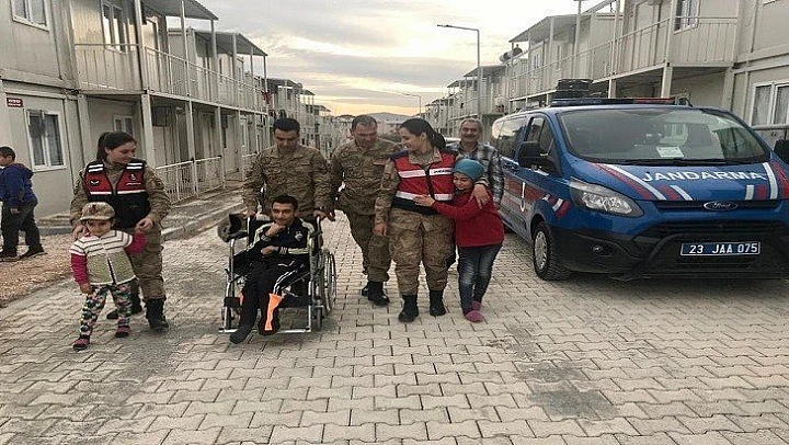 Elazığ'da depremde evleri ağır hasar gören 8 kişilik Tekocak ailesinin çocukları olan engelli Samet Tekocak'ı biran olsun yalnız bırakmayan Jandarma ekipleri, Samet'in tekerlekli sandalyesinin olmadığından dolayı sokağa çıkamadığını öğrenmeleri üzerine Samet e sürpriz yaptılar.