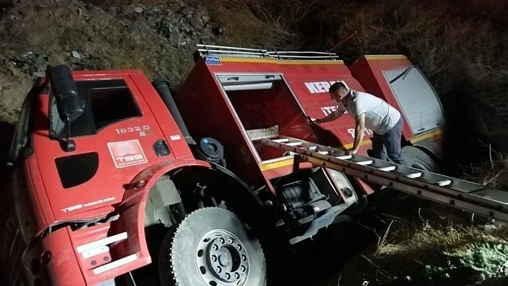Kamyon kazasına giden itfaiye aracı şarampole devrildi