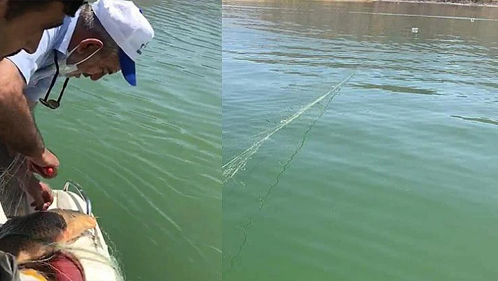 Keban Baraj Gölünde yapılan denetimlerde 2 bin metre kaçak balık ağı ele geçirildi. Sahibi belirlenemeyen ağa el konulurken, ağa takılan yaklaşık 150 Kg balık suya bırakıldı.