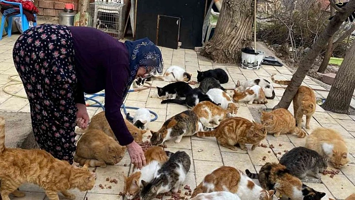 Elazığ'da 63 yaşındaki Nuriye Teyze, ailesiyle birlikte sokakta yaşayan 70'e yakın sokak kedisine kışın evinin içinde, yazın ise evinin bahçesinde çocuğu gibi bakıyor.