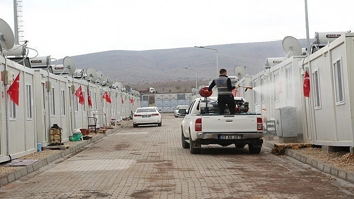 Yeni Korona virüs (COVID 19) salgınının Türkiye'de de görülmesinin ardından Elazığ Belediyesi Veteriner İşleri Müdürlüğü bünyesinde oluşturulan ekipler tarafından şehrin dört bir yanında toplu kullanım alanları ile kurum ve kuruluşlara yönelik dezenfekte çalışmalarına devam ediliyor. Ekipler tarafından 24 Ocak'ta Elazığ'da yaşanan depremin ardından evleri yıkılan ve hasar gören vatandaşların yaşamlarını sürdürdüğü konteyner kentlerde dezenfekte çalışması gerçekleştiriliyor. Yürütülen çalışma kapsamında depremzedelerin yaşamlarını sürdürdüğü konteynerler, çevreleri ve konteyner kentlerde bulunan çocuk oyun parkları titizlikle dezenfekte ediliyor.