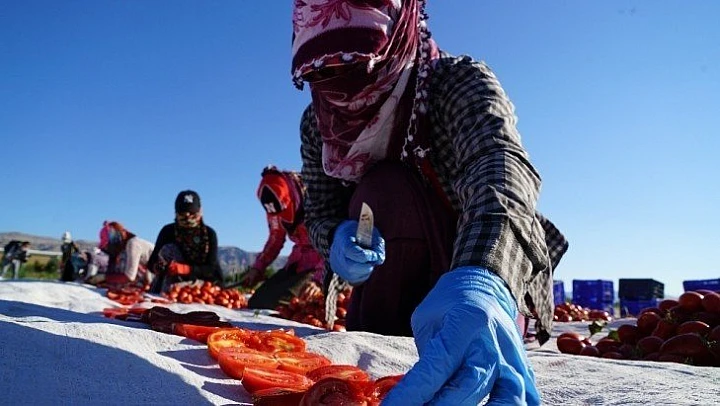 Elazığ'da kayısı, üzüm, domates ve çilek gibi çeşitli tarım işlerinde çalışan mevsimlik kadın işçilerin zorlu mesaisi devam ediyor. Şuanda Yurtbaşı Beldesi'nde üretilerek kurutulup ihracata gönderilen 700 ton domates işinde de kadın işçiler yoğun mesai harcıyor. Sabahın ilk ışıklarıyla tarlalara gelerek domates işinde hummalı bir çalışmaya başlayan kadın işçiler sıcak havaya rağmen yoğun mesai yapıyor. Büyük çoğunluğu şehir dışından gelen kadın işçiler, saat 07:00'da mesaiye başlıyor. Yaklaşık 1 ay boyunca sıcaklığa aldırış etmeden çalışan kadınlar tarafından toplanıp, kesilerek kurutulan 700 ton domates, dünyanın dört bir yanına gönderiliyor. Kurutulmuş domates işinden ekonomik kazanç elde eden kadınlar, böylelikle ülke ekonomisine de katkıda bulunuyor.
