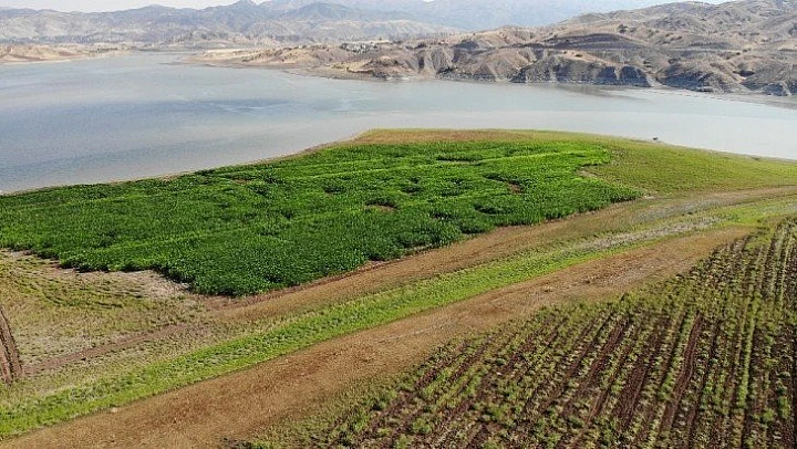 Elazığ'da Murat Nehri'nde suyun yaklaşık 2 kilometre çekilmesiyle çiftçiler, ortaya çıkan araziyi değerlendirerek mısır ve bostan ekerek tarıma başladı.