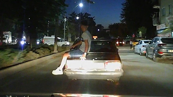 Edinilen bilgiye göre, Vali Fahri Bey Caddesi'nde seyir halindeki 31 PH 505 plakalı otomobilin bagajı üzerinde bir gencin yolculuk yaptığını görenler şaşkınlık yaşadı. Tehlikeli yolculuk başka bir otomobilin araç kamerasına ve vatandaşların cep telefonu kameralarına yansıdı. Bir süre trafikte ilerleyen otomobil, ardından Kültür Park'ın önüne park etti. Bagaja oturarak ilerleyen genç kendisini çekenlere el sallarken, vurdumduymaz hareketi pes dedirtti.