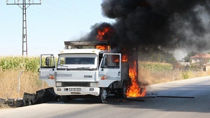 Plastik kasa yüklü kamyonet seyir halindeyken alev alev yandı