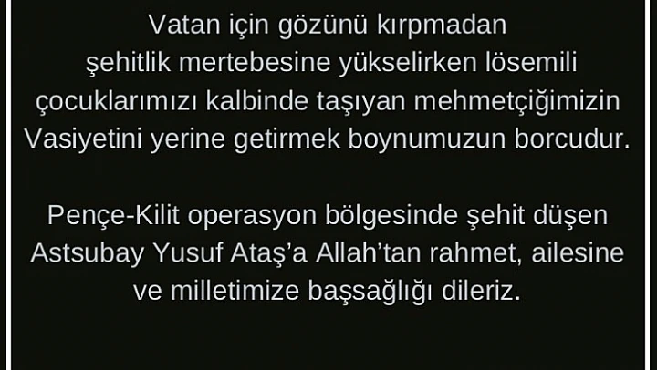 Pençe-Kilit operasyon bölgesinde şehit düşen Piyade Astsubay Yusuf Ataş'ın vasiyetini içeren görüntüler ortaya çıktı. Ataş vasiyetinde lösemili bir kız çocuğunun hayatı boyunca tüm masraflarının karşılanmasını ve bayramlarda anne ile babasının ziyaret edilerek ellerinin öpülmesini istedi. Bunun üzerine LÖSEV, sosyal medya üzerinden yaptığı anlamlı paylaşımda, 'Mehmetçiğimizin vasiyetini yerine getirmek boynumuzun borcudur' ifadeleri kullanıldı.