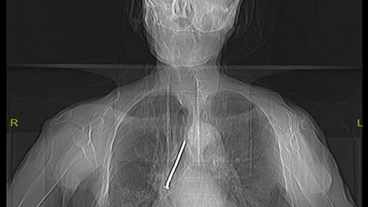 Hızlı bir şekilde müdahale edilmediği takdirde hayatı tehlikeye atabilen bir durumla karşı karşıya kaldıklarını belirten Dr. Kılıç, "Larenks kanseri nedeniyle 24 yıl önce boynundan nefes borusuna açılan açıklık aracılığıyla nefes alıp verebilen hasta, nefes borusundaki bu açıklığı temizlemek amacıyla kullandığı 10 santimlik çiviyi soluk borusuna kaçırmış. Bu nedenle gelişen öksürük ve nefes darlığı şikayeti ile önce başka bir sağlık merkezine başvurmuş, ardından Fethi Sekin Şehir Hastanemiz Göğüs Cerrahisi Kliniğine yönlendirilmiş. Biz de hastanede 91 yaşındaki hastamıza çektiğimiz tomografide soluk borusu içerisinde, sağ akciğer içerisine doğru kaçmış olan çiviyi tespit ettik” dedi.