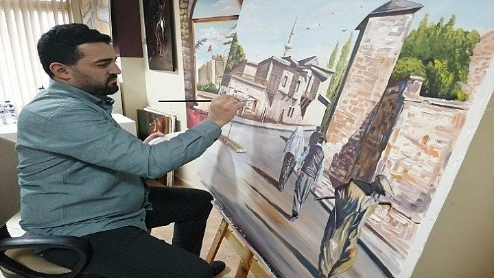 Kendine ait sanat atölyesinde çalışmalarını sürdüren Mehmet Sağlam, Elazığ'ın tarihi mekanlarını ve kültürünü tuvale aktarıyor.