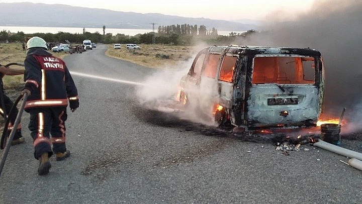 Elazığ'da bir araç seyir halendeyken alev aldı, kısa sürede büyüyen alevler aracı küle çevirdi.
