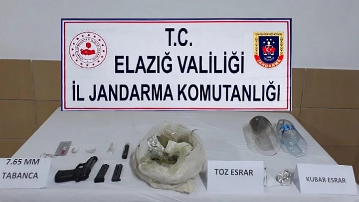 Elazığ'da jandarma ekiplerinin düzenlediği operasyonda 1 şüpheli gözaltına alındı, 1,5 kilogram toz esrarla birlikte çeşitli uyuşturucu maddeler ve 1 adet ruhsatsız tabanca ele geçirildi.