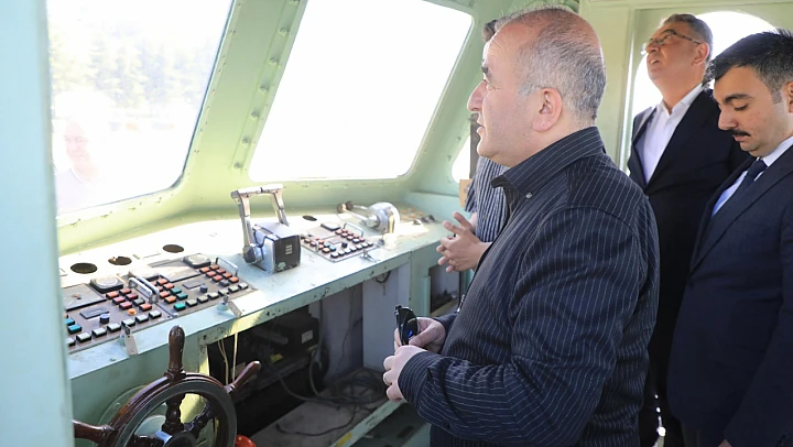 Elazığ Valisi Numan Hatipoğlu'da, Hazar Gölü'nde görev yapacak olan deniz temizleme aracında incelemelerde bulundu.
