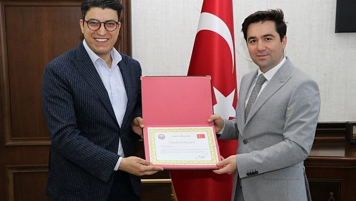 Sivrice Kaymakamı Yunus Emre Vural Bir Gelecek Genel Koordinatörü Mustafa Alpay'a teşekkür belgesi takdim etti.
