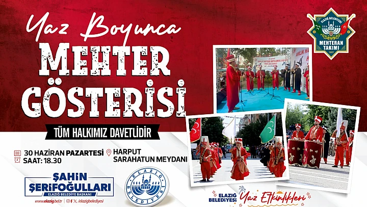 Mehteran konserinin ikincisi 1 Temmuz Pazartesi günü saat 19.00'da Harput Sarahatun Meydanı'nda gerçekleştirilecek. Elazığ Belediyesi Basın-Yayın ve Halkla İlişkiler Müdürlüğü'nden yapılan açıklamada, tüm vatandaşlar etkinliklere davet edildi.