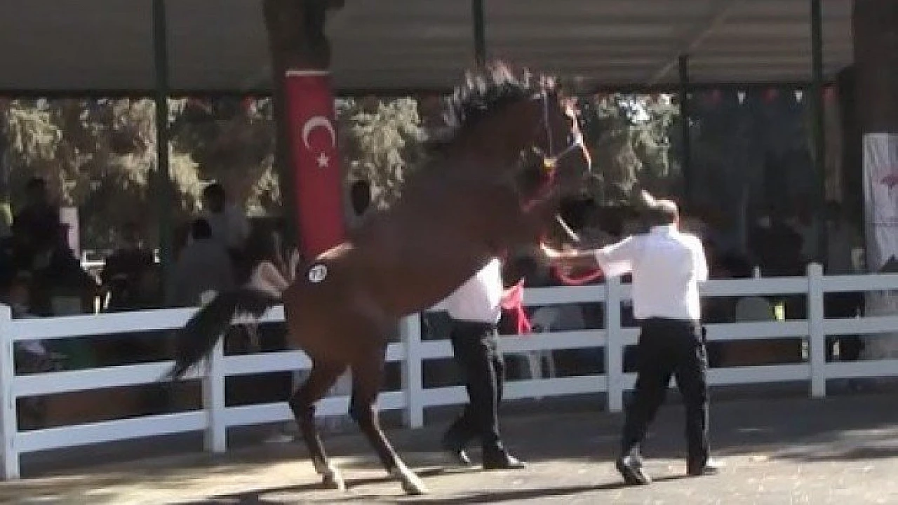 Karacabey Tarım İşletmesi'nde yetiştirilen ünlü Arap Yarış Tayları, Bursa'nın Karacabey ilçesindeki harada görücüye çıktı. Yapılan açık artırmada 'Serhat Fırtınası' isimli tay, 220 bin liraya satıldı. Açık arttırma sırasında podyuma çıkarılan 'Alevkıran' isimli tayın bakıcısını tepme anı kameralara yansıdı. Tüm katılanların şok olduğu olayda yaralanan bakıcı ambulansla hastaneye kaldırıldı.