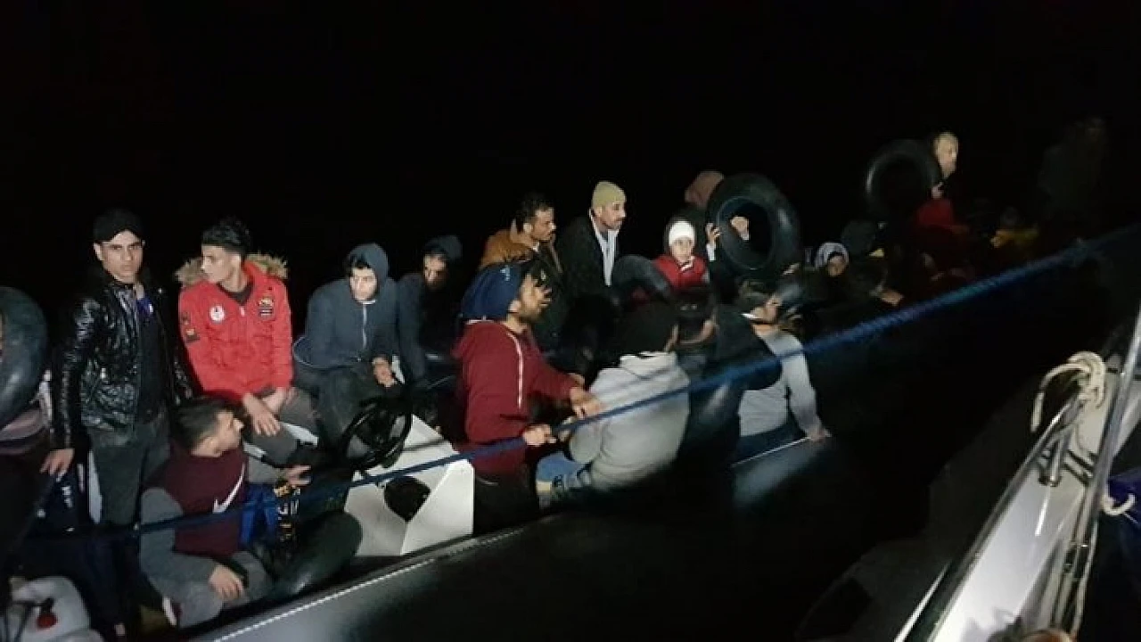 Aydın'ın Didim ilçesi açıklarında , Sahil Güvenlik botu tarafından lastik botla yurt dışına kaçmaya çalışan 12 erkek, 6 kadın, 9 çocuk, 27 kaçak göçmen yakalandı.