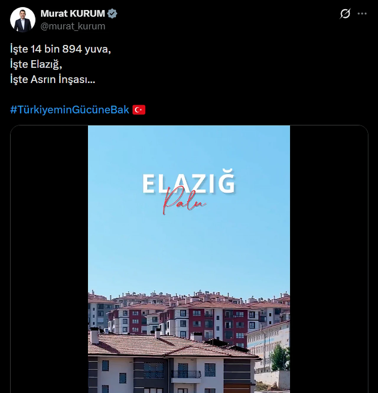 Bakan Kurum paylaşımında: “İşte 14 bin 894 yuva, İşte Elazığ, İşte Asrın İnşası...” notuna yer verdi.