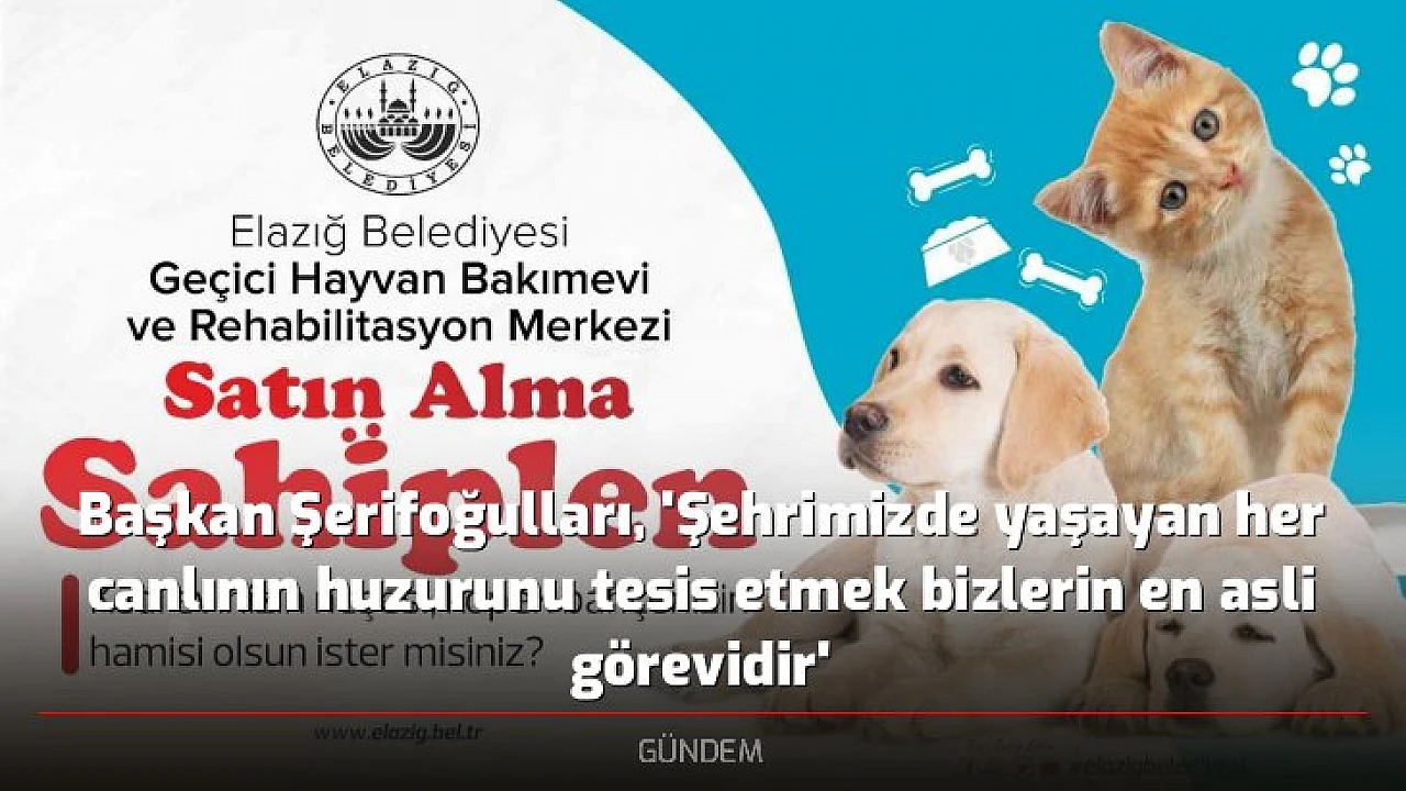 Sokakta yaşayan hayvanların sahiplendirilmesinin önemine değinen Elazığ Belediye Başkanı Şahin Şerifoğulları “Gönül Belediyeciliği ilkesi ile çıktığımız bu yolda şehrimizde sadece gözle görülür projelerin yanında gönüllere dokunan çalışmalarımızla da hizmet etmeye devam ediyoruz. Şehrimizde yaşayan her canlının huzurunu tesis etmek bizlerin en asli görevidir. Bu doğrultuda can dostlarımız için başlattığımız bu kampanya hayvanseverler tarafından ciddi oranda karşılık bulacaktır. Kedi ve köpek sahiplenmek isteyen vatandaşlarımız Elazığ Belediyesi Geçici Hayvan Bakımevi ve Rehabilitasyon Merkezi’ne başvuruda bulunsunlar. Şimdiden başlattığımız bu kampanyaya destek olarak hayvan sahiplenen hemşehrilerime gösterdikleri hassasiyetten dolayı teşekkür ederim” dedi.